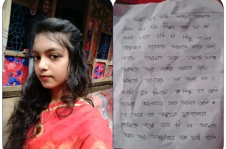 মা আমি মরে যাচ্ছি, আমার মৃত্যুর জন্য সম্পূর্ণভাবে দায়ী রাফি, চিরকুটে এ কথা লিখে নিজ ঘরে গলায় ফাঁস দিয়ে আত্মহত্যা করেছে ফারজানা আক্তার বৈশাখী (১৫) নামে এক স্কুলছাত্রী।