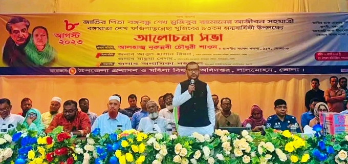 ভোলার লালমোহনে জাতির জনক বঙ্গবন্ধু শেখ মুজিবুর রহমানের সহধর্মিণী বঙ্গমাতা শেখ ফজিলাতুন্নেছা মুজিব এর ৯৩ তম জন্ম বার্ষিকী উপলক্ষে উপজেলা প্রশাসন ও মহিলা বিষয়কের আয়োজনে আলোচনা সভা অনুষ্ঠিত হয়েছে।